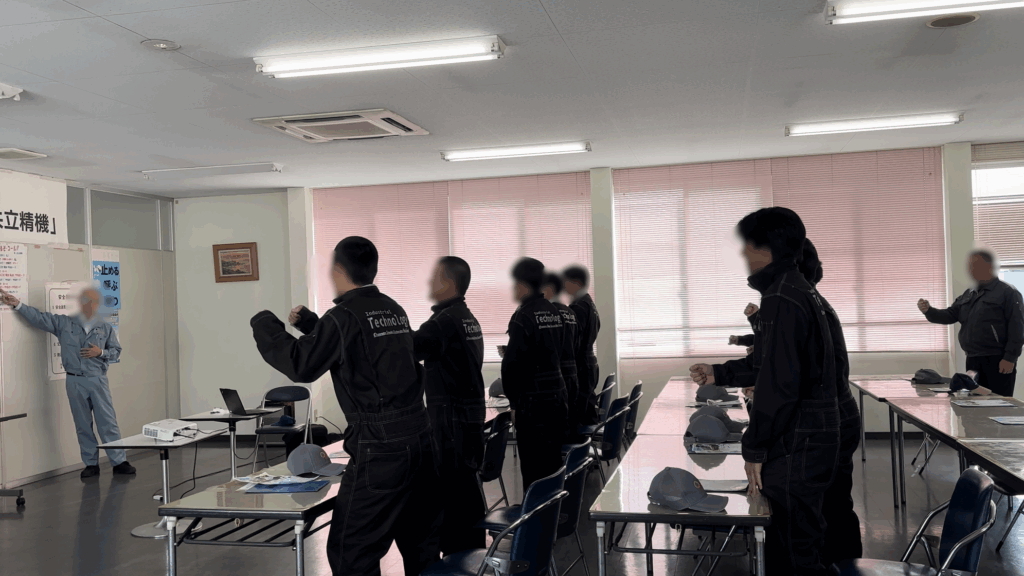 「やるぞコール」は、当社の朝礼等で行われるもので、キャッチーなフレーズと大きくこぶしを突き上げる動作が特徴です。少し気恥ずかしさもあったようですが、大きな声でコールし同じ班のメンバーと共に貴重な時間を楽しんでいただけたようです。