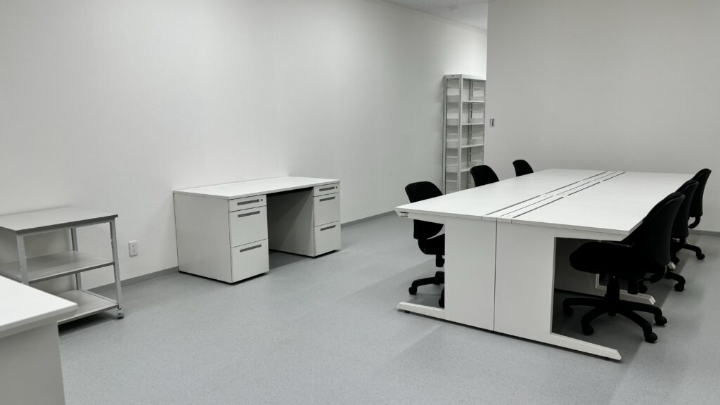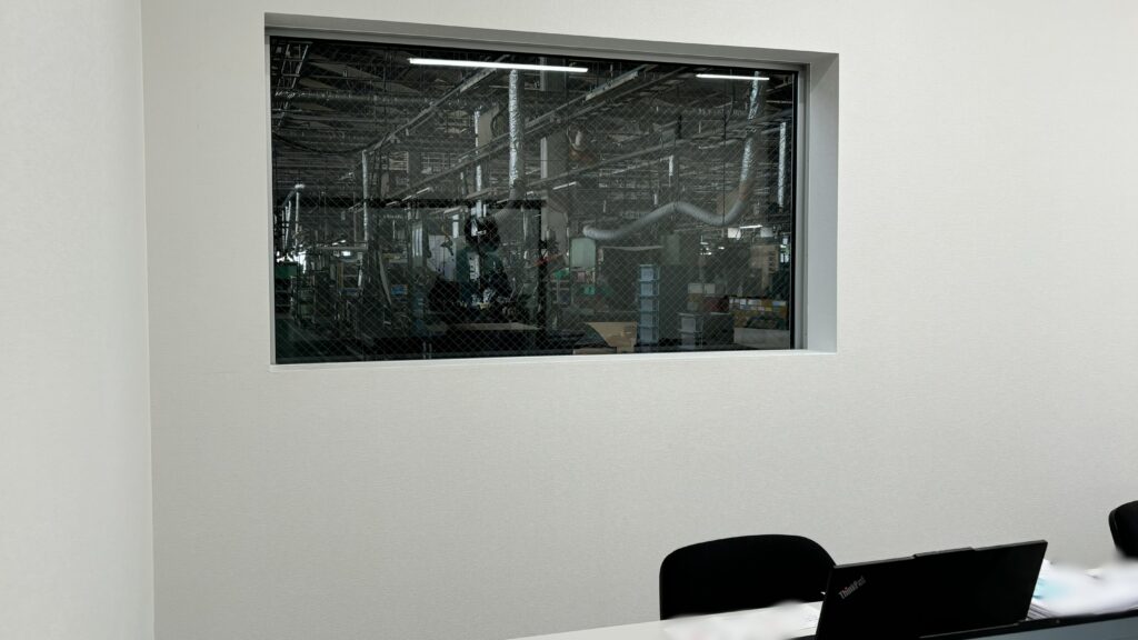新事務所は、第三工場北側の更衣室スペース等を整理して新設され、生産部・品質管理室・開発係・保全係がワンフロアで事務業務を行えるようになりました。工場と事務所を互いに確認できる大型のガラス窓も設置され、現場との距離感も近くなりました。