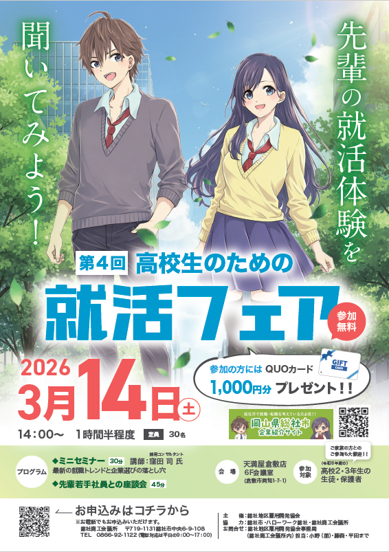3月14日(土)に天満屋倉敷店にて開催された、「第4回 高校生のための就活フェア」へ当社も参加を行いました。