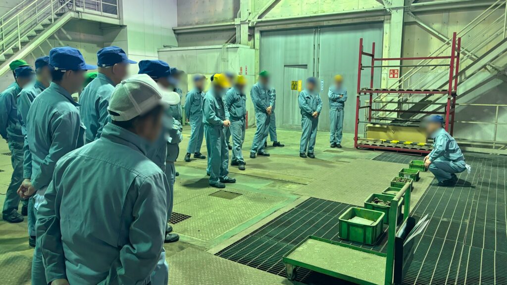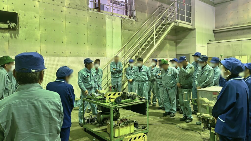 体感訓練は、毎回同じ内容を繰り返し学びますが、慣れやうっかりによる労働災害が起こらないよう、年に一度身を引き締めるためにも、工場内業務に従事する社員全員が参加し行います。