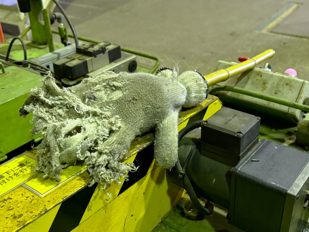 工場内の機械の中には、スイッチを切っていてもエアーの残圧が原因で動作する物、安全装置が働いていても復旧後に予期せぬ動作が起こるなど物など、「○○だから大丈夫」という安心に潜む危険性があります。体感訓練機で長年使われてきた模擬軍手の損傷を見ても分かるように、機械によるはさまれ・巻き込まれによる被害は重篤なものです。